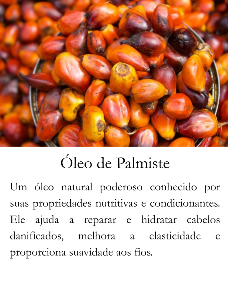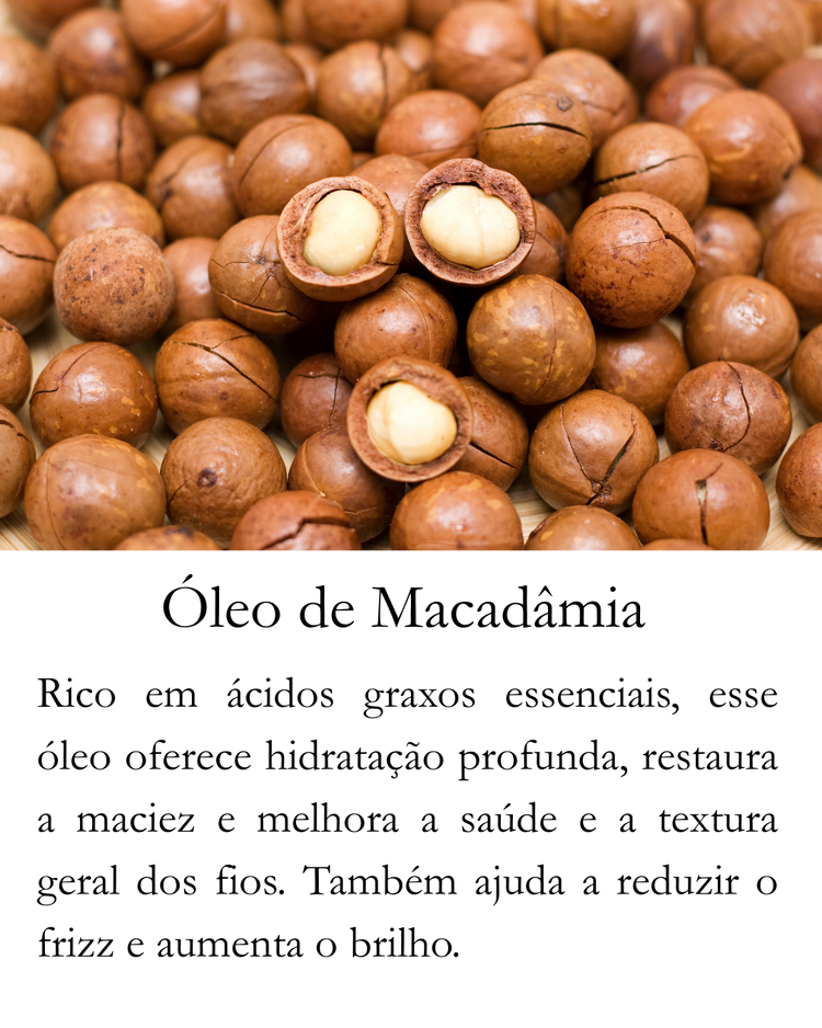 Óleo reparador e protetor térmico com óleo de macadâmia e palma vermelha, que hidrata, protege contra o calor e proporciona brilho.