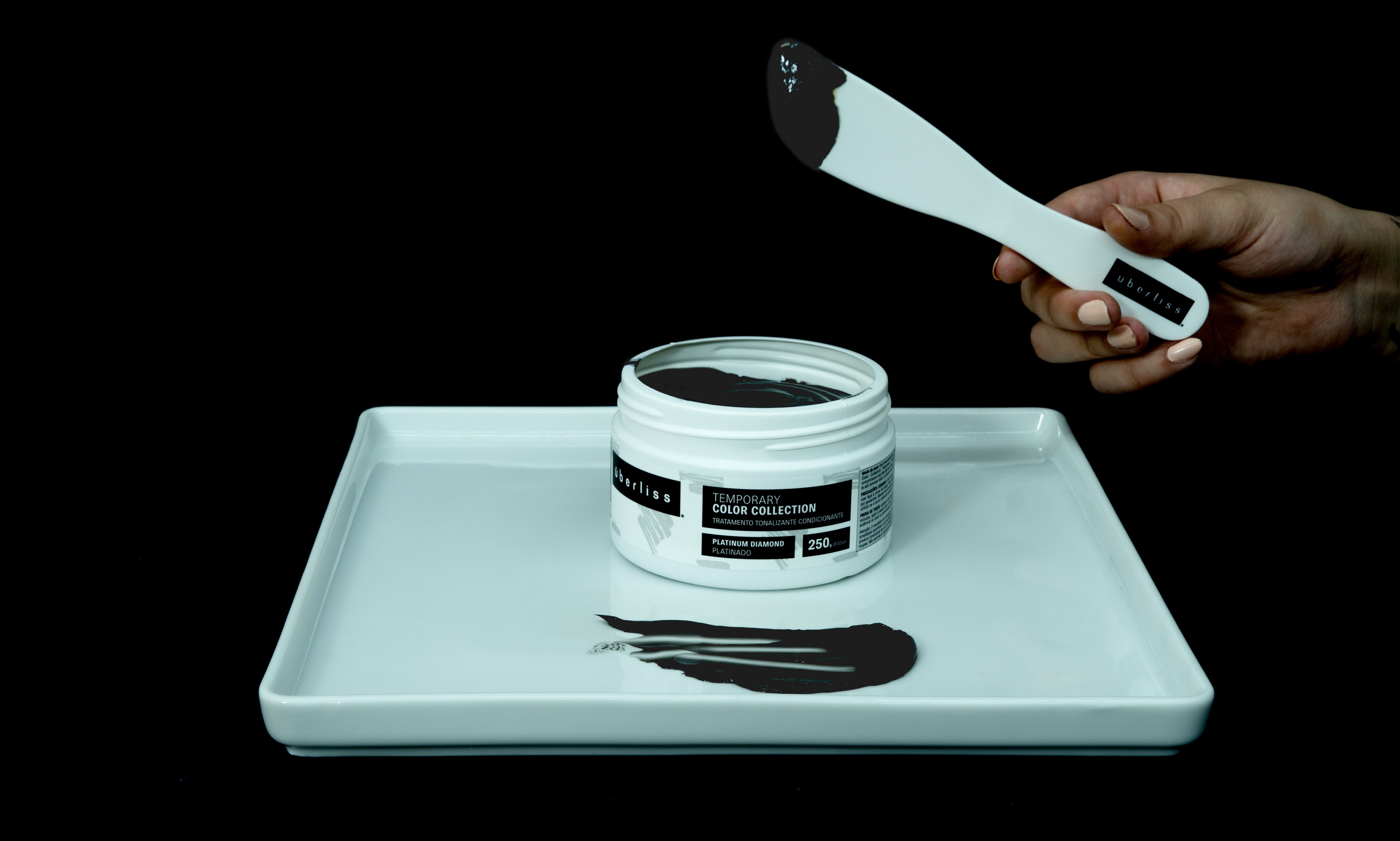 MODO DE USO: Com os cabelos descoloridos e lavados, retire o excesso de umidade e aplique Uberliss Temporary Color Collection Tratamento Tonalizante Condicionante Obsidian Elegance Preto espalhando uniformemente em todo o comprimento dos fios até as pontas. Deixe agir por até 30 minutos, sempre acompanhando a evolução da cor. Enxágue abundantemente até remover todo o produto dos cabelos. Repita a operação se achar necessário.